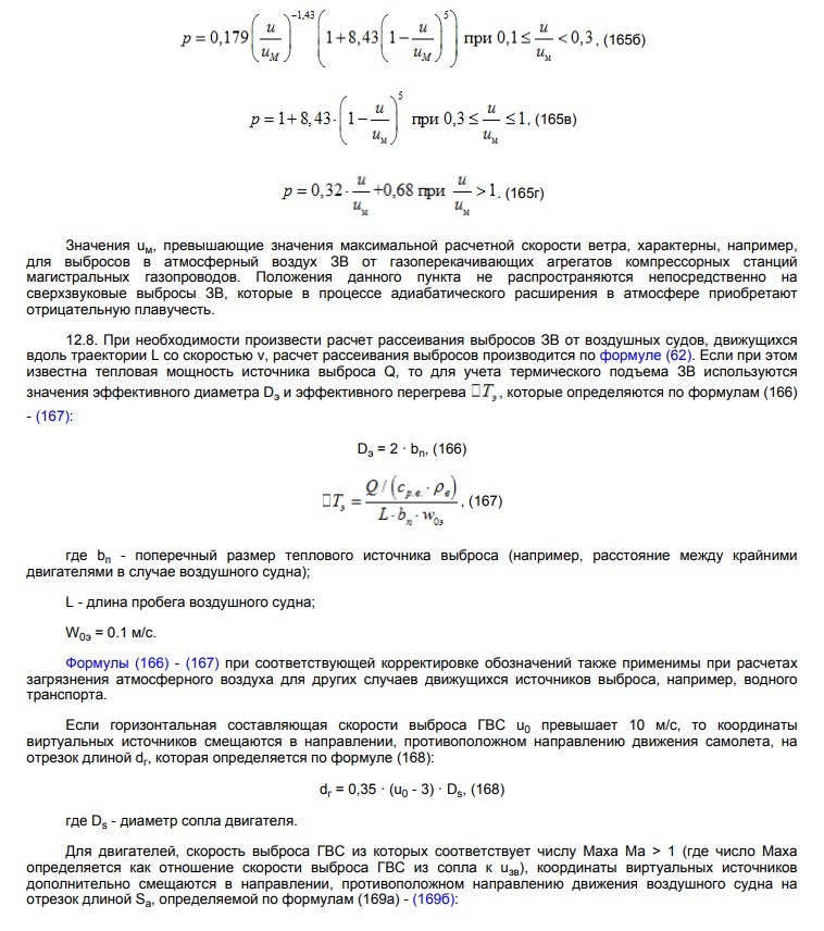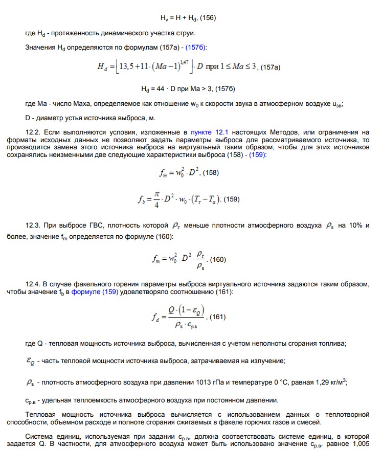 Если скорость w0 выхода струи ГВС из устья источника выброса превосходит скорость звука в атмосферном воздухе uзв, то расчет рассеивания выбросов также проводится на основе положений, изложенных в пункте 12.2 настоящих Методов.